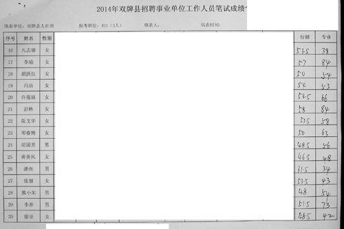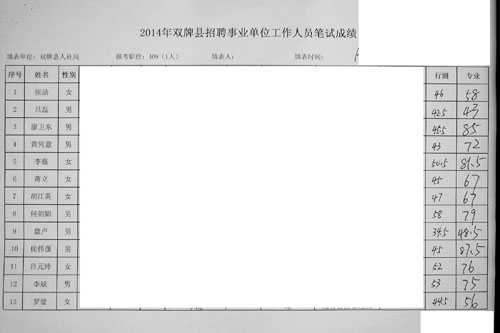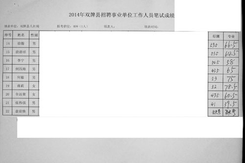 2014年双牌县招聘事业单位工作人员笔试成绩