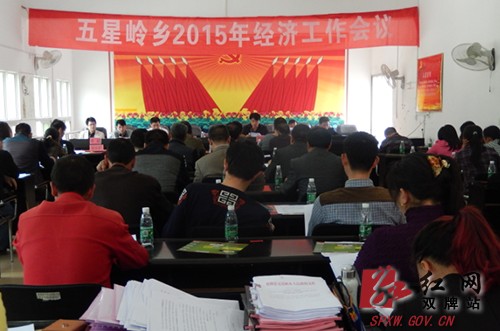 经济工作会议客观回顾总结2014年成绩,明确2015年发展总体思路和经济社会发展主要目标,继续坚持“一二三四五”工作思路,即深入开展党的群众路线教育实践这一活动,做人民群众贴心人;进行小城镇建设和村庄整治两篇文章;实现“社会和谐、财政增长、农民增收”三大目标;推进“横江河流治理、通畅通达公路建设、水利设施维护、大径材培育”四大项目;做好“珍贵树种、特色水果、苗木基地、水产养殖、生态休闲”五大产业。会议宣读了《五星岭乡关于表彰2014年度先进村和先进个人的决定》;会上对获得表彰的先进单位和个人颁发了奖金和荣誉证书,同时,各村递交了2015年各项工作的责任状。