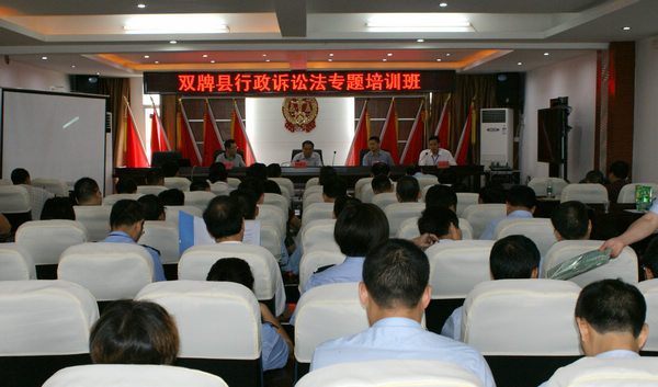 5月21日,双牌县《新行政诉讼法》培训班在县人民法院举行。专门邀请永州市中级人民法院行政庭副庭长蒋跃兵、审监庭副庭长曾辉授课。全县部分行政机关首长、法制专干,县法院各庭室负责人及行政庭全体人员等五十余人参加了培训。