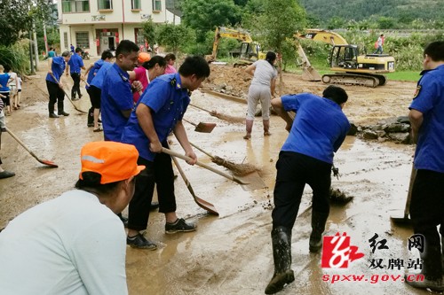 10日5时30分,由45人组成的抢险救灾队伍紧急赶往麻江村、廖家村实施灾后重建工作。特别是队伍中的党员干部,充分发挥模范带头作用,不怕疲劳,持续作战,使得整个灾后公共区域冲扫清洗工作热火朝天。