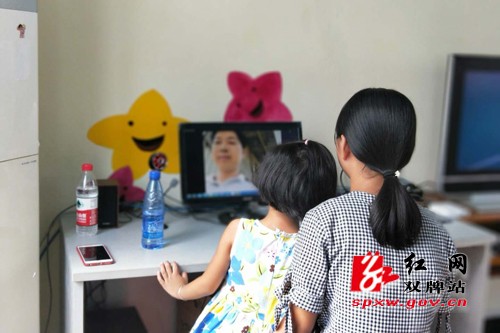 “小兔子乖乖,把门开开,不开不开就不开,妈妈没回来”伴随着欢快的儿歌,志愿者们在活动大厅教小朋友们跳舞。游戏结束后,一名小女孩盘某在志愿者的帮助下,通过电脑与外出务工的爸爸接通了视频,开心的笑容挂在了孩子的脸上。“孙女今年刚满六岁,父母亲在佛山打工,一年难得见面,真的感谢你们提供电脑让孙女看看爸爸”在一旁的奶奶满怀感激地说道。