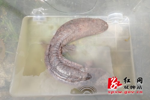 本网讯 8月16日,双牌县市民蒋某在日月湖国家湿地公园的河滩边发现了一条非比寻常的“鱼”,这鱼居然还长了四只脚。通过大家的讨论和搜索网络,蒋某意识到这很可能是国家保护野生动物——“娃娃鱼”,便立即联系了县林业局部门。