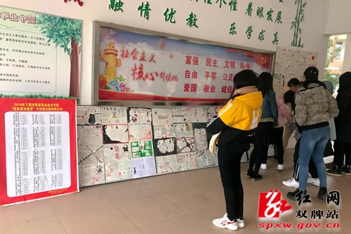 (双牌职中的学生在“禁毒宣传教育”手抄报前驻足而观)