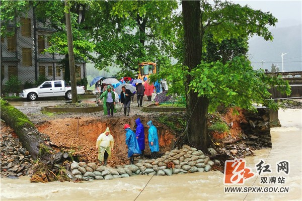 由于洪水的持续冲涮,阳明山学校一度出现严重险情,校门崩塌的护坡前一棵200多年的古树在洪水中炭炭可危,如果被洪水冲倒在河中,损失珍稀古树的同时还直接威胁到学校和附近村庄的安危。阳明山管理局紧急调度抢险队员用沙袋加固护坡,身边是滚滚的洪水,头上是磅请大雨,30多名干部群众奋战5小时,用沙袋筑成一道挡水墙,全力保护古树,保护学校和村庄的安全。