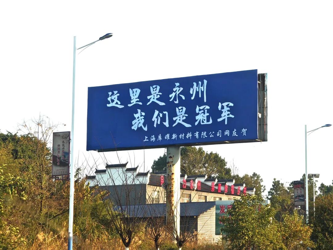 本网讯 (通讯员 汤翔)1月11日上午,一块印着“这里是永州 我们是冠军”的蓝色广告牌,在双牌县主干道五里牌镇全家洲村路段亮相。这是继江苏江宁、高淳网友后,上海网友为祝贺永州队斩获2025湘超冠军送上的又一份跨省祝福,让这场民间自发的跨区域足球应援热潮再度升温。