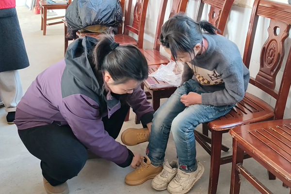 活动现场暖意融融,志愿者将200件厚实冬衣、50双保暖鞋整齐摆放,逐一询问孩子尺码,并为他们穿衣系带、调整衣物,确保穿着舒适。此外,志愿者还带来200斤红糖、400本作业本及1000支笔等物资。拿到新衣物和学习用品,孩子们脸上绽放出灿烂的笑容。