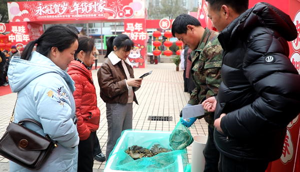 活动现场年味十足,红色主题展板与喜庆布置交相辉映,选购年货的市民络绎不绝。江苏宿迁洪泽湖大闸蟹展销摊位前早早排起长队,买到螃蟹的市民满脸笑意。
