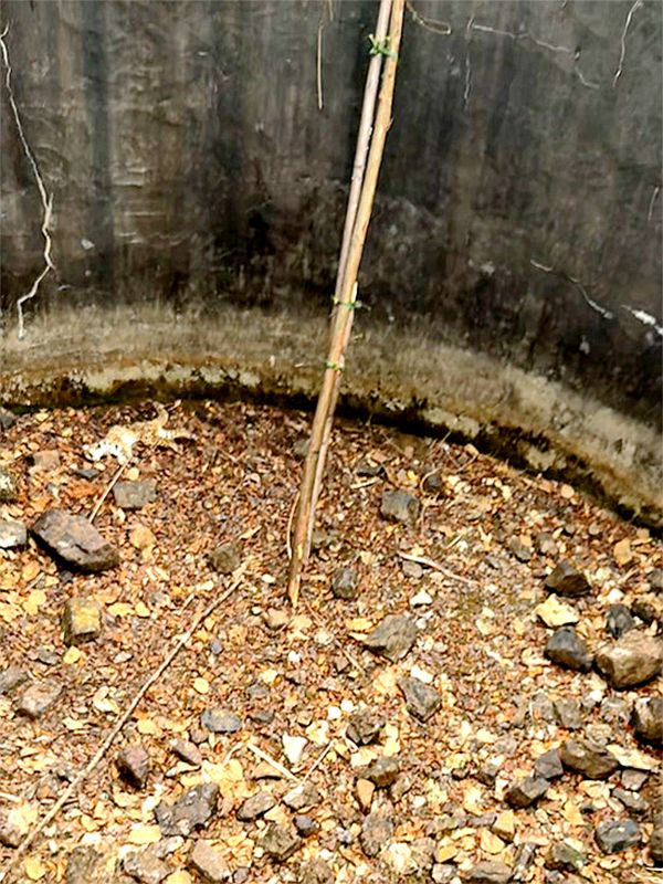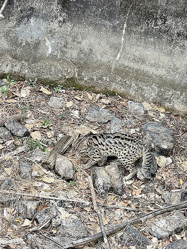 为尽快将豹猫救出,民警就地取材,迅速用木棒和棕树叶扎成一条简易“救援桥”,斜搭入池中。起初豹猫缩在角落警惕张望,在民警耐心地守候与轻声引导下,才小心伸爪试探攀爬。最终它敏捷跃上地面,迅速消失在附近树林中。