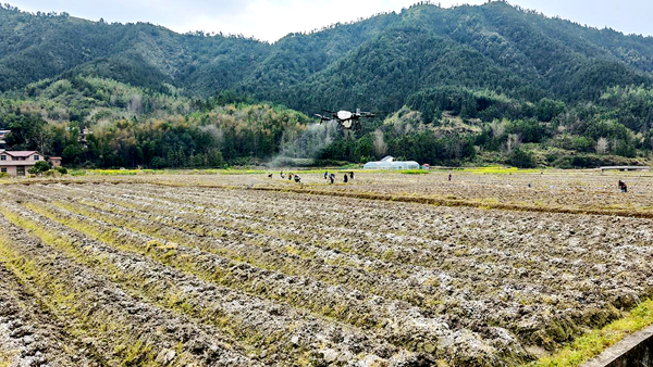 与此同时,一架植保无人机在田垄上空平稳飞行,均匀喷洒药剂,为刚移栽的烟苗保驾护航。相较于传统人工喷洒,无人机作业不仅效率提升数倍,还能实现精准施药、减少农药浪费,既降低了烟农劳动强度,又提升了病虫害防治效果。