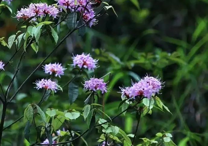 与花朵、叶片硕大的刺毛杜鹃不同,溪畔杜鹃的花叶比例恰到好处,层次鲜明,簇簇拥拥地开成一个个紫色花团,像从绿叶间探出头来看风景的小精灵,清透优雅。溪畔杜鹃多生于海拔750至1200米的山谷密林中,别看它花花小朵、幼干纤细,最高却能长到3米。